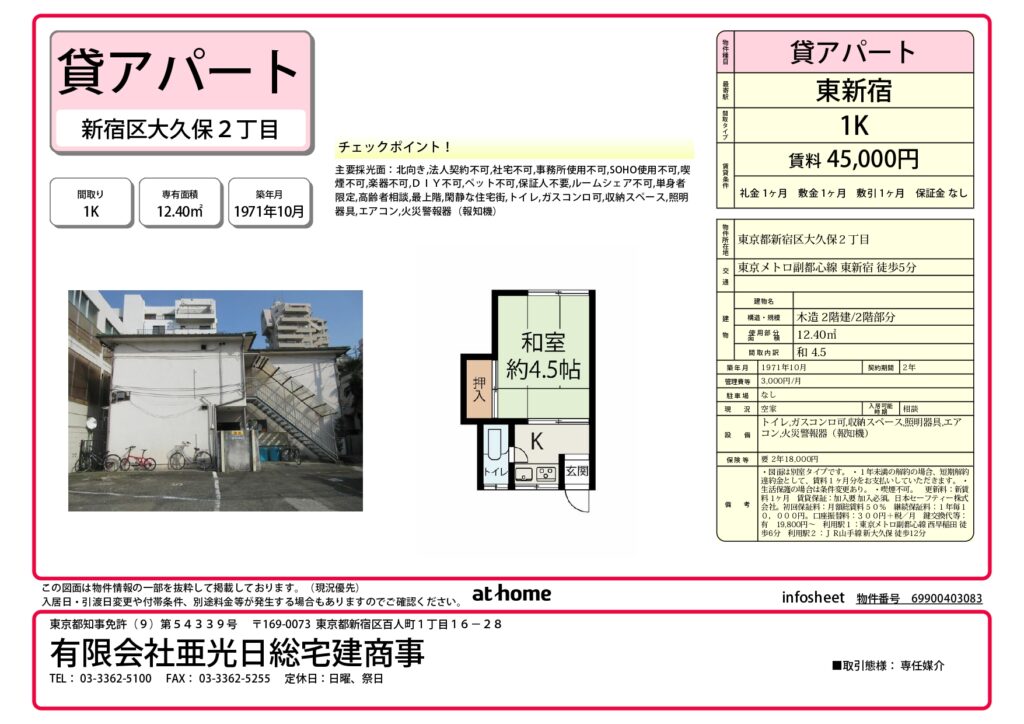 新宿区大久保2丁目にある単身者限定の1Kアパートのご紹介です。